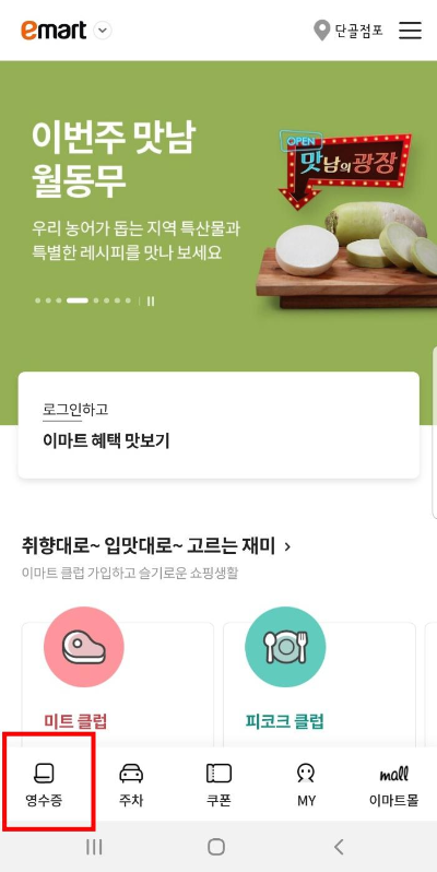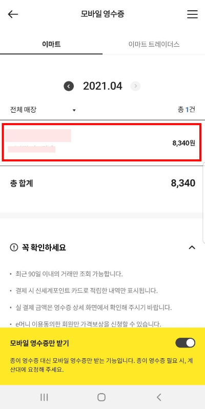 2. 이마트 앱에서 모바일 영수증 탭 열기